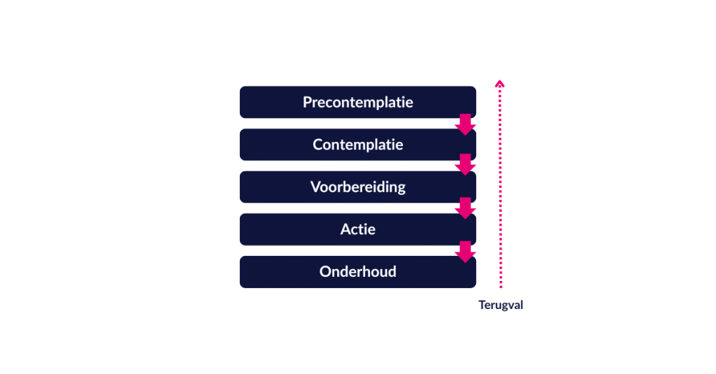 - Onderhoud: De persoon houdt het gedrag langere tijd vol. De focus ligt op het versterken van gewoontes en het voorkomen van terugval.