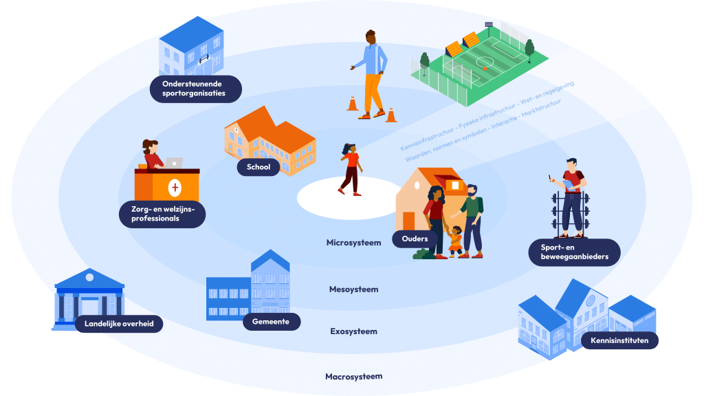 - Exosysteem: Indirecte invloeden, zoals gemeentebeleid of een werkgever die beweging stimuleert via flexibele werktijden.