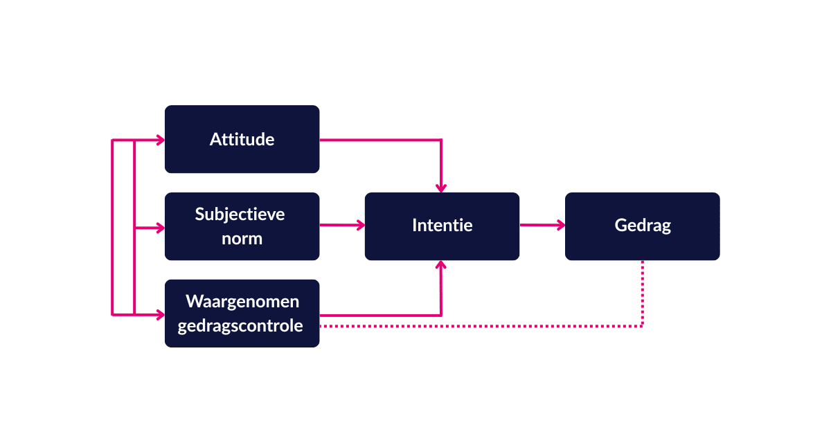 - Begin met belangrijke voorspellers van gedrag: Attitude, normen en zelfeffectiviteit zijn belangrijke voorspellers voor intenties en gedrag (Theorie van gepland gedrag). Maar let op: dit is niet het hele verhaal. Gedrag wordt door meer beïnvloed. Als professional heb je aanvullende inzichten en strategieën nodig om gedrag te veranderen.