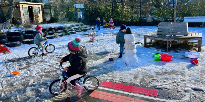 Als we peuterspeelzaal Dribbel begin 2024 bezoeken, is het speelplein helemaal wit. Midden op het plein staat een sneeuwpop, minstens zo groot als de kinderen in de groep van Marja Spierieus. “Hebben de kinderen vanmorgen vroeg gemaakt”, zegt Marja. Ondanks de sneeuw is te zien dat er veel tijd en zorg aan het plein wordt besteed. Het heeft een zandbak, speelhuis, glijbaan, verkeersplein, moestuin, vijver en verschillende klim- en klauter-elementen. De kinderen hebben beschikking over een grote hoeveelheid (loop)fietsjes en ander los speelmateriaal. Een grote ‘modderkeuken’ maakt het plein helemaal af. “Altijd succes, die modderkeuken bij deze leeftijd”, zegt Marja.