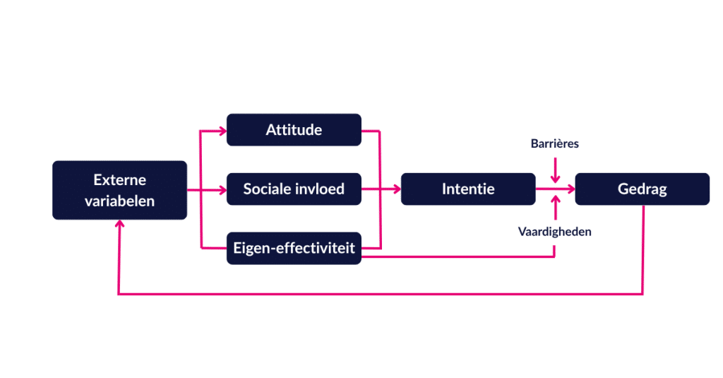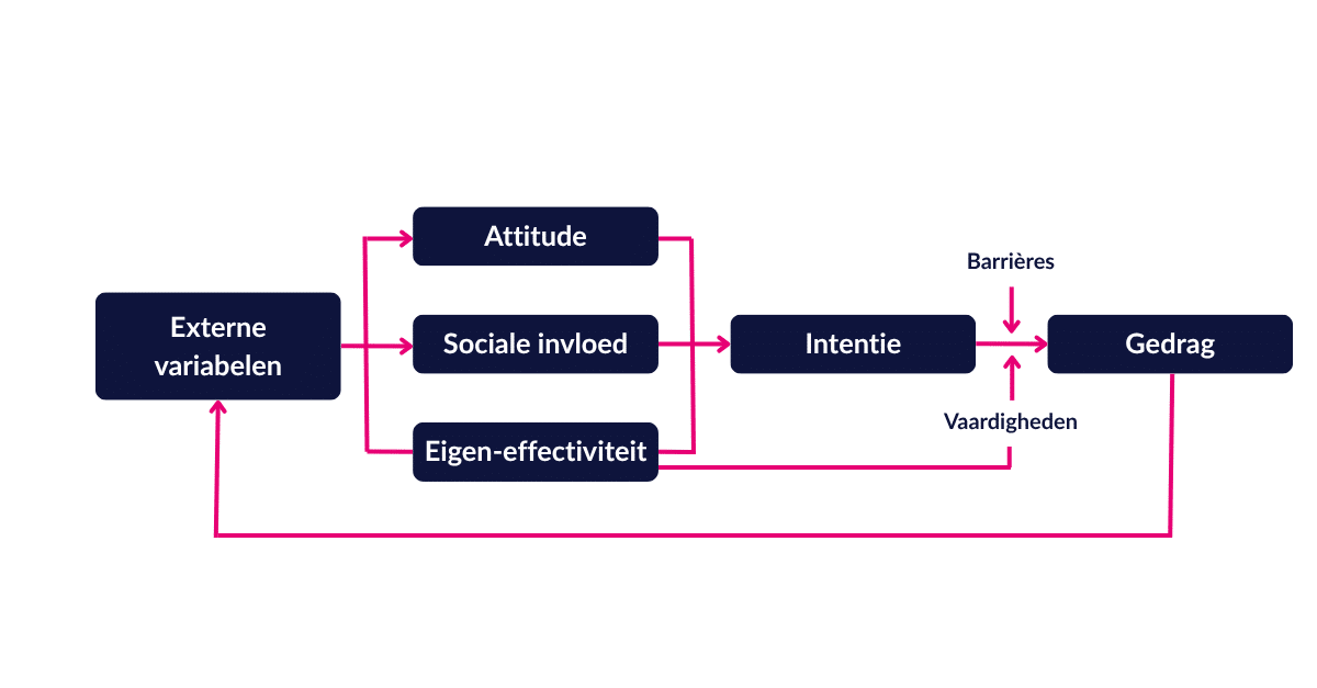 Volgens het ASE-model wordt de intentie gevormd door drie kernfactoren: attitude, sociale invloed en eigen-effectiviteit. Daarnaast spelen externe variabelen, barrières en vaardigheden die nodig zijn om het gedrag uit te voeren een rol.