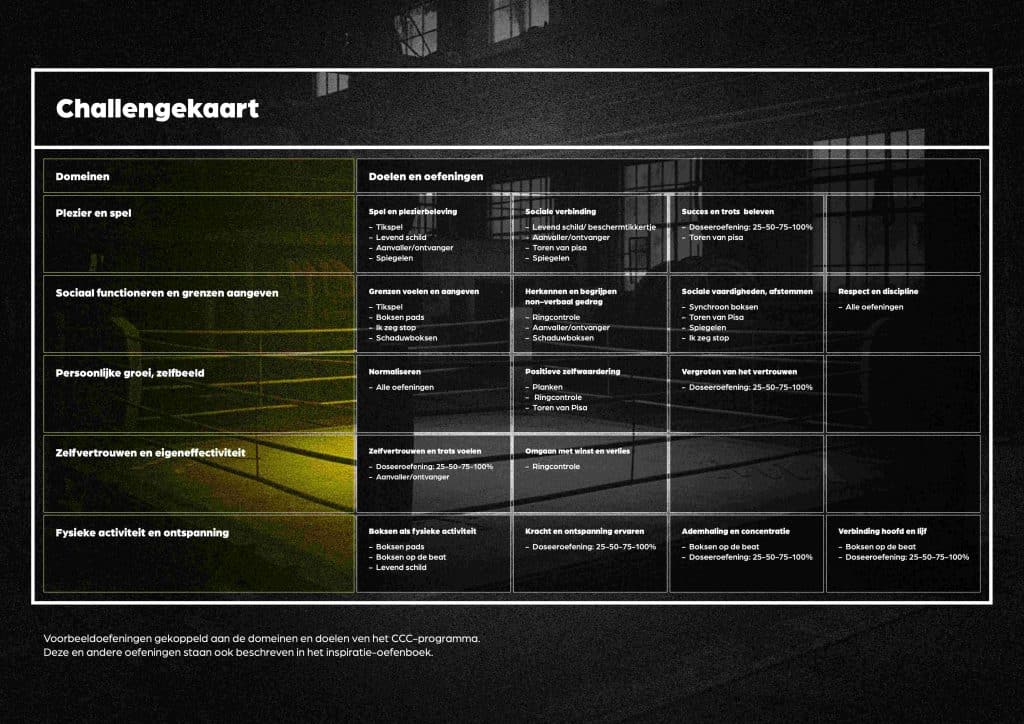 Voor hen is het programma Challenge, Change, Confidence (CCC) ontwikkeld: een preventief boksprogramma voor jongeren en jongvolwassenen[6]. Omdat boksen kan bijdragen aan het verminderen van angst en depressie en het vergroten van zelfvertrouwen en weerbaarheid[7-11] is voor deze sport gekozen.