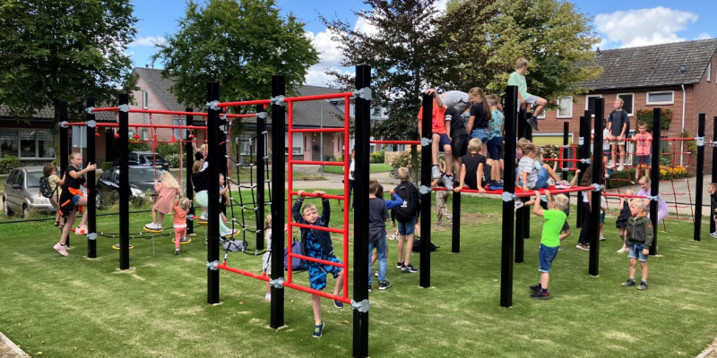 - Creëer mogelijkheden voor ringen, touwen, slackline en duikelstangen met kunstgras als ondergrond[8];